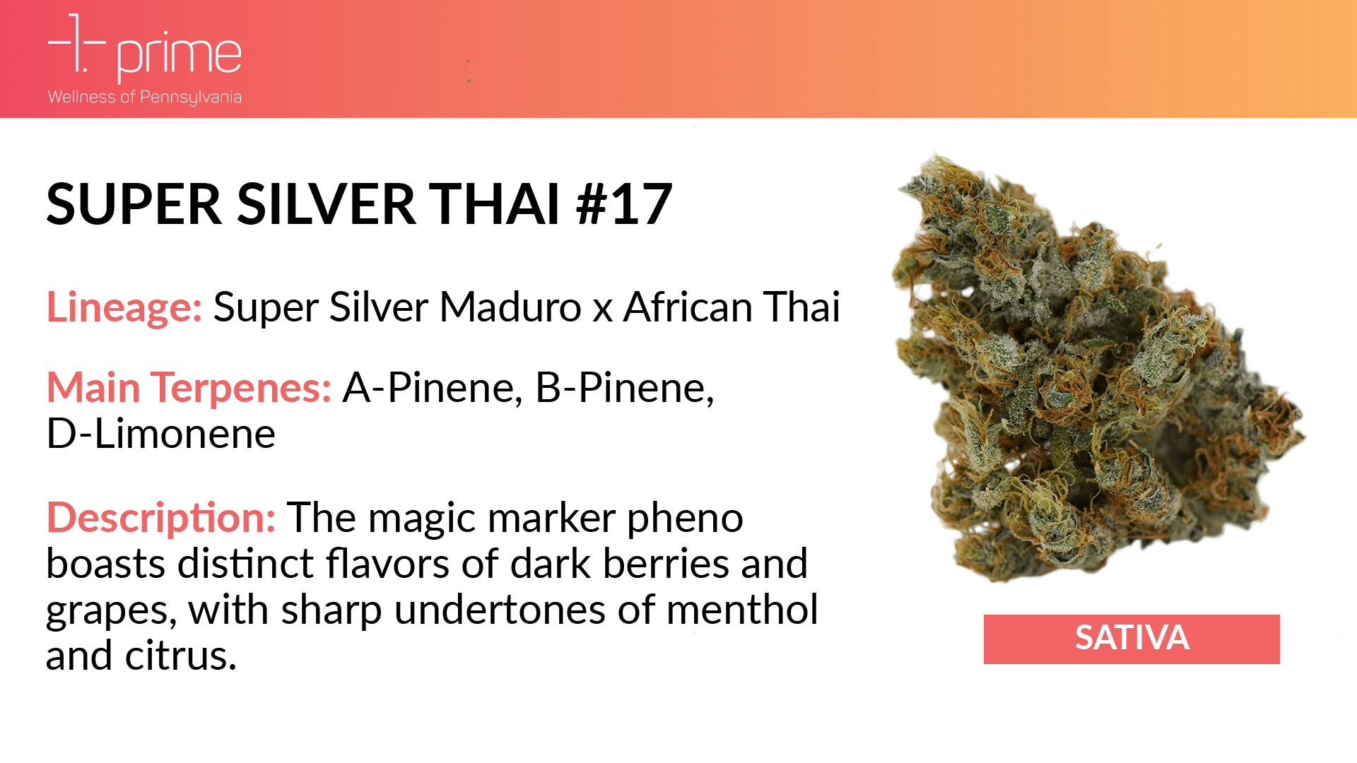 Planting the Seed: The Super Silver Thai cultivar is a cross between Super Silver Maduro and African Thai, sativa strains that boast strong trichome coverage. True to their Super Silver Maduro lineage, both Super Silver Thai phenos display narrow leaf structures that are covered in trichomes— the glands that are responsible for the medical marijuana plant’s resin production. Super Silver Thai stems from coveted Black Maduro and Super Silver Haze genetics, a testament to the expert curation of our genetic library. According to John Watson, our Director of Production, “Super Silver Maduro was a production cultivar for us in the early days of prime.” Watson says that the intention behind crossing Super Silver Maduro and African Thai genetics was to create new cultivars that “carried much of the same cannabinoid and terpene potency of the African Thai, but maintained some of the same qualities of the female being pollinated.”